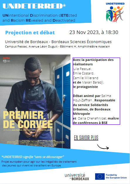 Screening and discussion of the film ‘Premier de corvée’ at the University of Bordeaux with the participation of the directors and the protagonist.